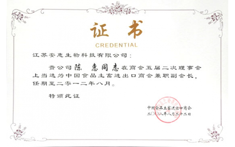 2008年8月22日,陳惠董事長在中國食品土畜進出口商會五屆二次理事會上當(dāng)選兼職副會長。