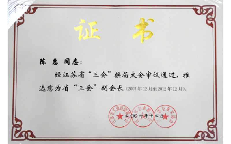 2007年12月,陳惠董事長(zhǎng)當(dāng)選“三會(huì)”(江蘇省工業(yè)經(jīng)濟(jì)聯(lián)合會(huì)、江蘇省企業(yè)聯(lián)合會(huì)、江蘇省企業(yè)家協(xié)會(huì))副會(huì)長(zhǎng)。