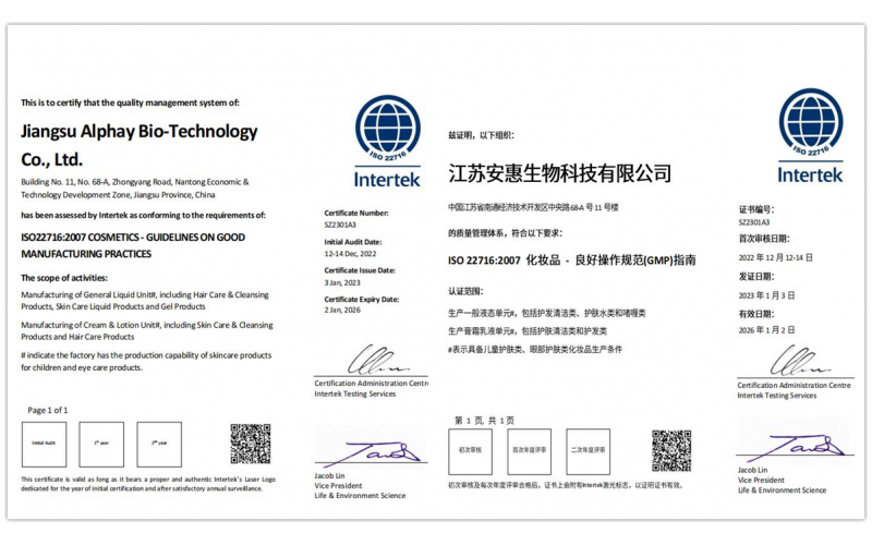 2023年1月,安惠公司化妝品生產(chǎn)系統(tǒng)順利通過(guò)認(rèn)證公司Intertek的嚴(yán)格審核,獲得ISO22716質(zhì)量管理體系認(rèn)證,即國(guó)際化妝品GMP認(rèn)證。化妝品GMP管理系統(tǒng)的目標(biāo)是通過(guò)對(duì)生產(chǎn)流程中的每項(xiàng)工作、每個(gè)環(huán)節(jié)和每道工序都進(jìn)行高標(biāo)準(zhǔn)的規(guī)范和要求,消除和防止產(chǎn)品在制造過(guò)程中的質(zhì)量缺陷,避免化妝品產(chǎn)品對(duì)使用者的潛在危險(xiǎn);GMP認(rèn)證的最大優(yōu)點(diǎn)是證實(shí)生產(chǎn)企業(yè)的廠房、人員、設(shè)施、材料的采購(gòu)和使用及產(chǎn)品制造過(guò)程控制、工廠和人員衛(wèi)生管理、質(zhì)量管理體系均達(dá)到了世界先進(jìn)水平。